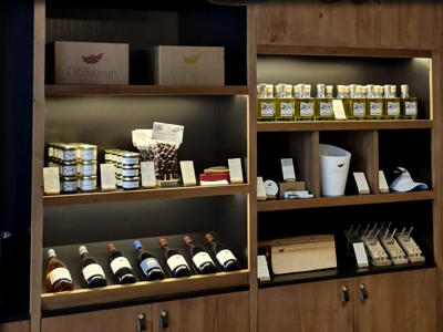Vous trouverez au caveau l'autre production du domaine qui est l'huile d'olive, ainsi que des produits locaux pour agrémenter vos apéritifs comme la tapenade, des olives, de l'houmous et des jus de fruits. Quelques idées cadeaux vous sont proposés comme des portes bouteilles ou des planches apéritives en bois réalisés par un menuisier local et un tirage à très peu d'exemplaire d'un couteau gravé au nom du Domaine Dambrun avec un manche en bois provenant d'un fût d'élevage du domaine.